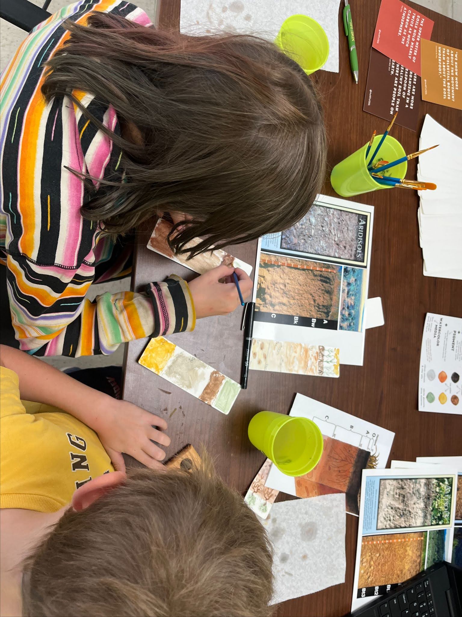 We presented an all-ages activity at the Albany County and Laramie County Ag & Arts Tours, organized by University of Wyoming Extension. Participants looked up the typical soil profile of their home, farm, or ranch through SoilWeb, discussed it, then used soil-based watercolor paints from The Art of Soil to paint bookmarks of their soil profile.